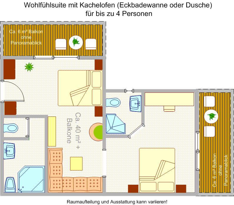 Beachten Sie bitte, dass in der Hauptsaison in der großen Wohnlfühl-Suite mindestens für 4 Personen gebucht werden muss. Für 3 Personen stehen unter anderem die Familienzimmer zur Verfügung.
